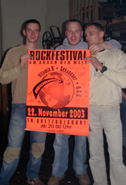 | 22.11.2003 Gasthaus "zu Quetz" Quetzdölsdorf "Rock am Arsch der Welt" Unser vorerst letzter Auftritt beim kleinen Musikfestival zusammen mit den Bands Vitamin B aus Zörbig und den "Ostsibirischen Schnarchschnecken" aus Naumburg |